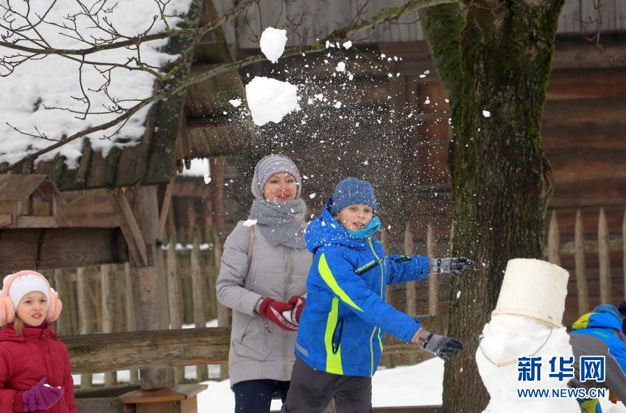 1月24日,孩子們在白俄羅斯首都明斯克郊區(qū)的民族建筑博物館內打雪仗。新華社發(fā)(任科夫攝)