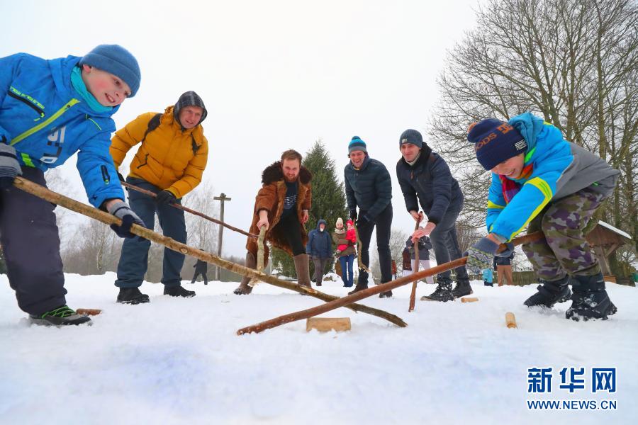 1月24日,人們在白俄羅斯首都明斯克郊區(qū)的民族建筑博物館參與傳統(tǒng)的冰雪游戲。新華社發(fā)(任科夫攝)