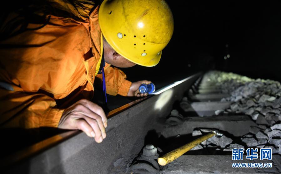 在廣西河池境內(nèi)黔桂鐵路線上的鄧山隧道,中國鐵路南寧局集團有限公司柳州工務段的4名看守工輪換值班,依靠手電筒在黑暗中穿行,及時巡查隧道中可能出現(xiàn)的各種隱患,確保每天經(jīng)隧道運行的59趟客貨列車春運安全。鄧山隧道全長773米,是一個需要人員全天候看守的鐵路隧道。