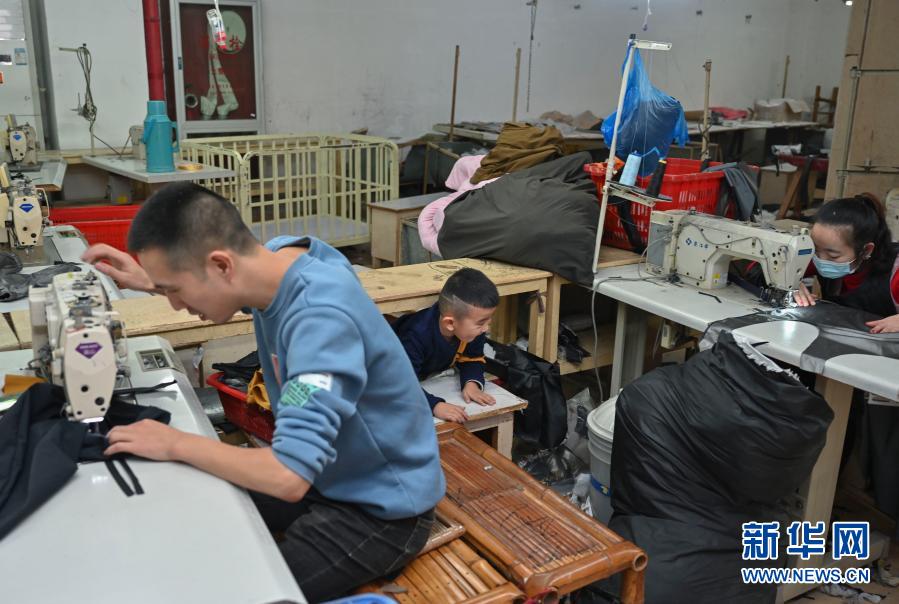 1月26日,在福建省石獅市的金利萊斯服裝廠(chǎng),黃海龍和妻子在為老家的親人縫制枕頭和袖套,聰聰在一旁玩耍。