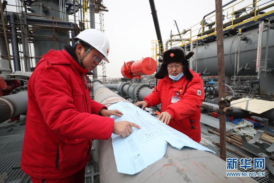 2月3日,在遼河油田雙臺子儲氣庫群一期工程現(xiàn)場,來自湖北孝感的工程技術(shù)人員劉單明(左)和同事在現(xiàn)場工作。今年他留在施工現(xiàn)場過年,確保工期目標如期完成。