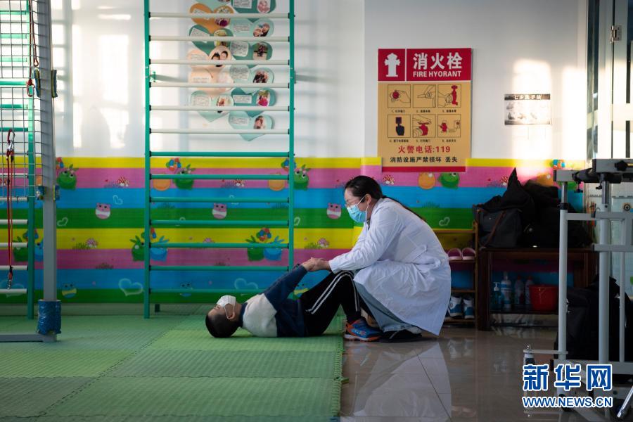 在哈爾濱博能中醫(yī)門(mén)診部,劉雨晴為腦癱兒童進(jìn)行康復(fù)訓(xùn)練(2月2日攝)。