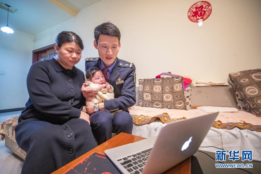 2月10日,在重慶市渝中區(qū)的家中,付寶印與妻子孫夢(mèng)潔一起抱著兒子同吉林老家的母親視頻通話。新華社記者 黃偉 攝