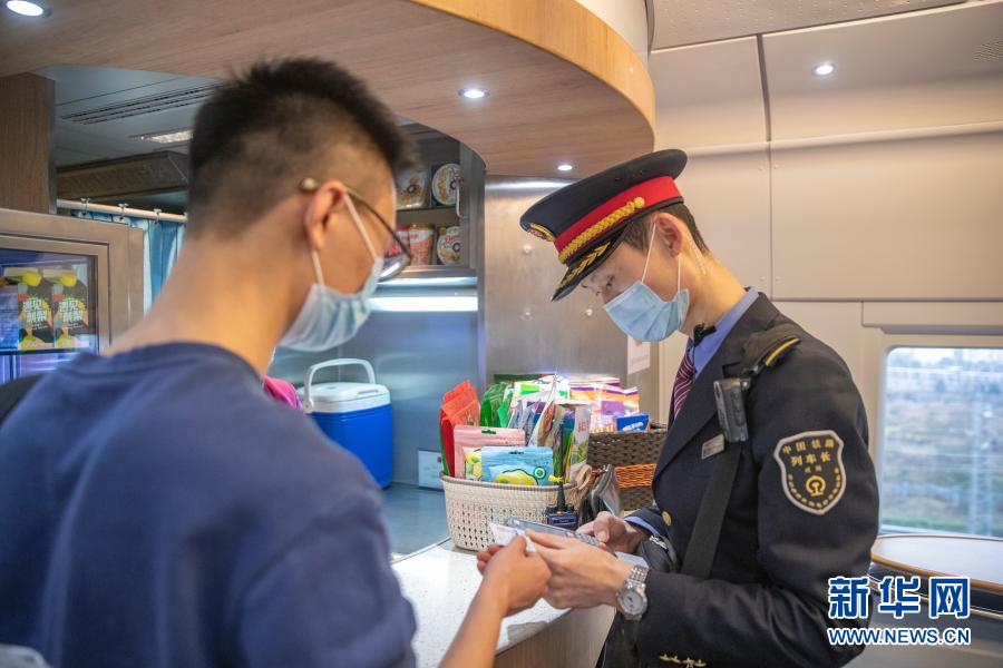 2月9日,在重慶北開往萬州北的C6422次列車上,付寶印為一名旅客辦理補(bǔ)票業(yè)務(wù)。新華社記者 黃偉 攝