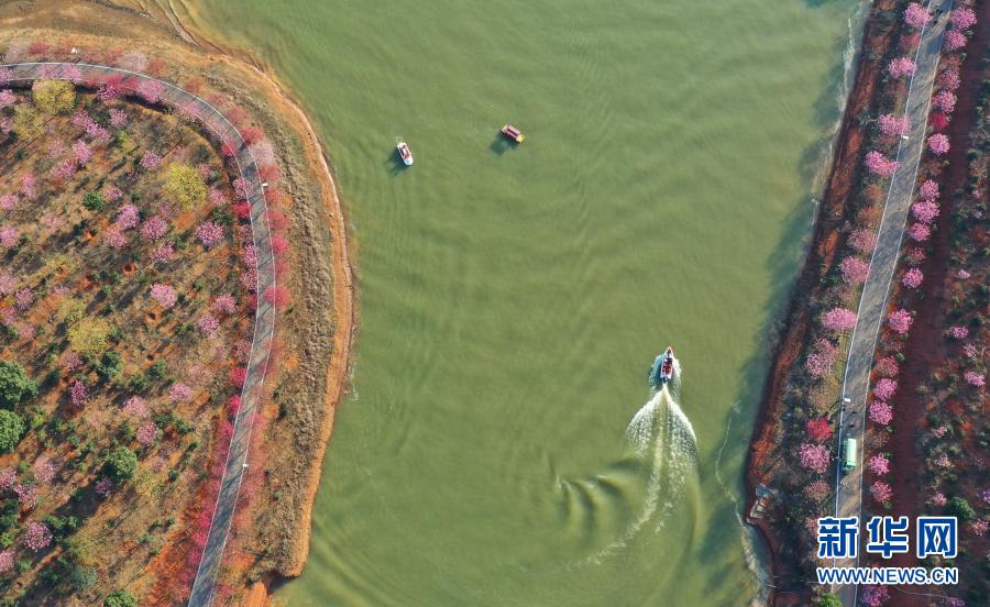 2月14日,游客在湖南省常寧市羅橋鎮(zhèn)櫻花園游玩 (無人機照片) 。新華社發(fā)(曹正平 攝)
