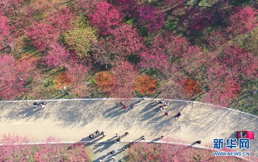 2月14日,游客在湖南省常寧市羅橋鎮(zhèn)櫻花園游玩 (無人機(jī)照片) 。新華社發(fā)(曹正平 攝)