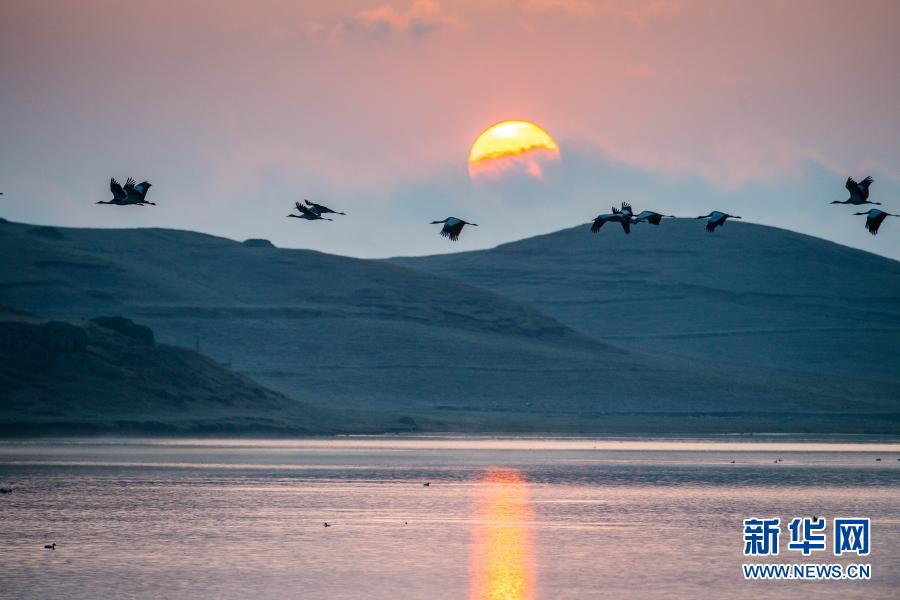 日出時分,黑頸鶴在大山包黑頸鶴國家級自然保護區(qū)飛翔(2月25日攝)。新華社記者 胡超 攝