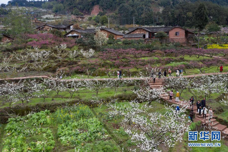 3月1日,游客在幸福古村里游玩(無(wú)人機(jī)照片)。新華社記者 江宏景 攝