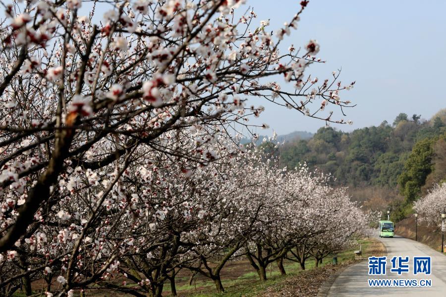 3月2日,一輛觀光車在蘇州上方山國家森林公園內(nèi)開滿鮮花的小道上前行 。新華社發(fā)(杭興微 攝)