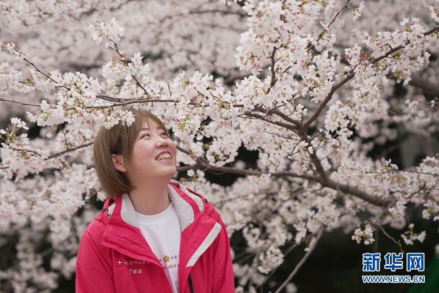 3月13日,武漢雷神山醫(yī)院醫(yī)護人員在櫻花樹下賞花。新華社記者 熊琦 攝