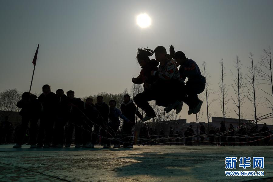 騎路小學的學生們在大課間練習“大網(wǎng)繩跳”(3月10日攝)。