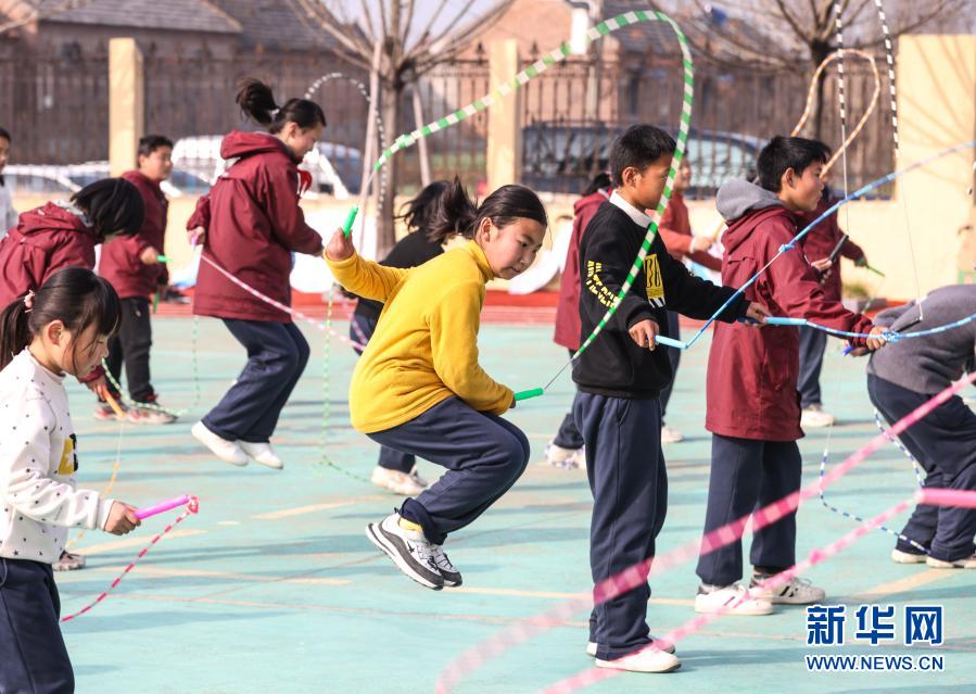 騎路小學(xué)的學(xué)生們在體育課上進(jìn)行跳繩鍛煉(3月10日攝)。新華社記者 楊磊 攝