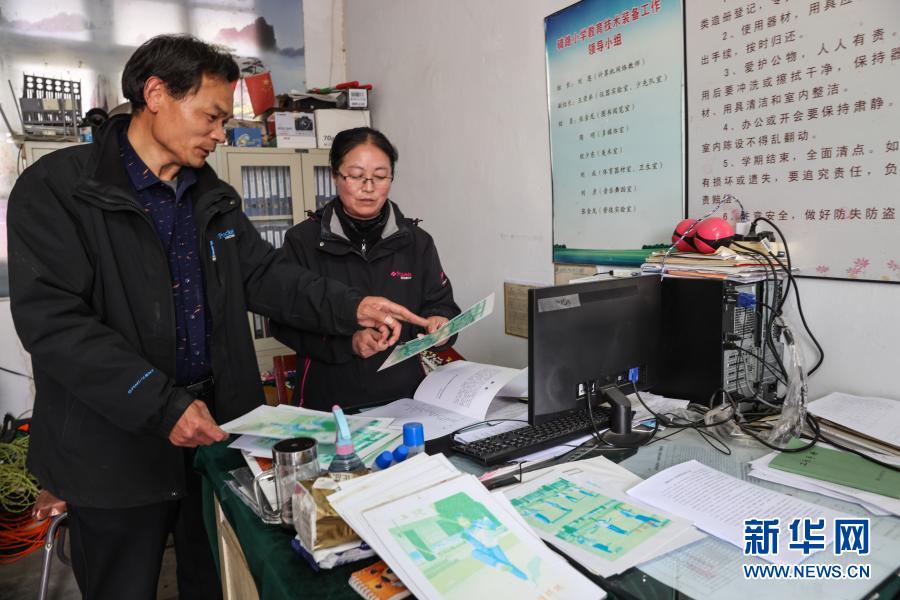 騎路小學(xué)劉恩校長(zhǎng)(左)和劉彥老師商討跳繩課程綱要(3月9日攝)。新華社記者 楊磊 攝