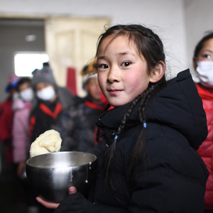 3月16日,在索加鄉(xiāng)寄宿小學(xué)食堂,白瑪措毛(前)和同學(xué)們一起打飯。