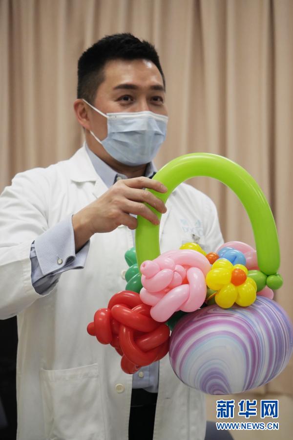 在香港東區(qū)醫(yī)院,“氣球大夫”陳諾文醫(yī)生展示他制作的氣球花籃(3月16日攝)。