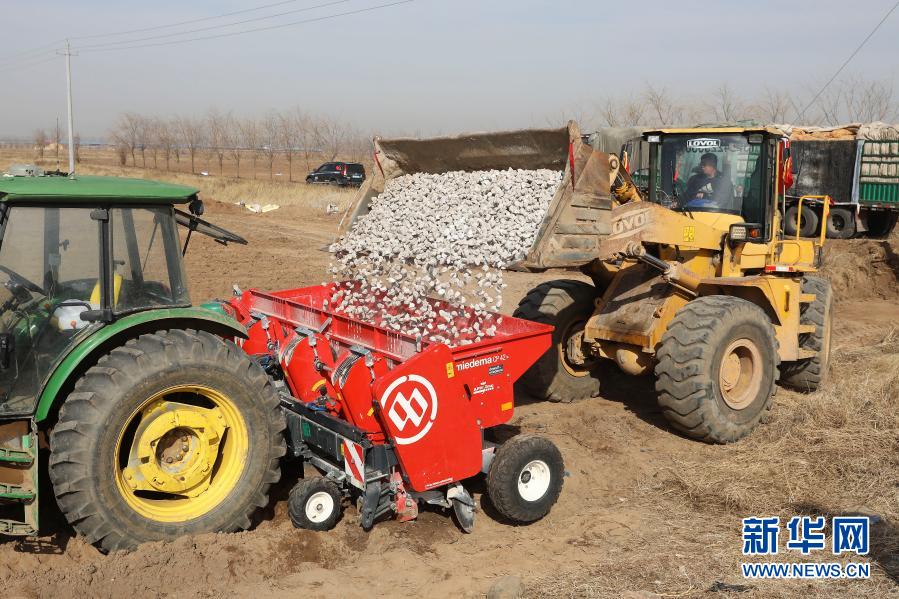 3月23日,工人操作機(jī)械設(shè)備在河北省張家口市萬全區(qū)孔家莊鎮(zhèn)張杰莊村轉(zhuǎn)運(yùn)馬鈴薯種。