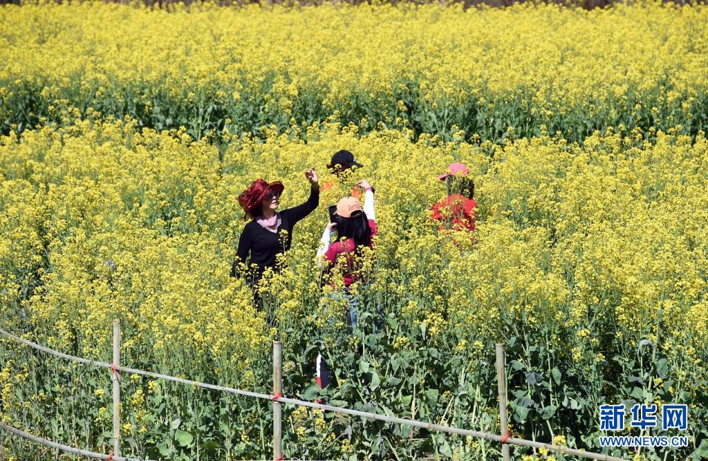 3月26日,游客在黃山市徽州區(qū)靈山村的花海中踏青游覽。