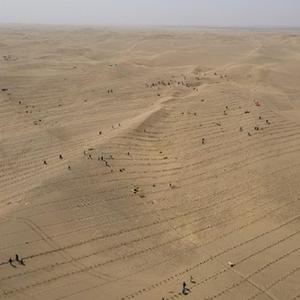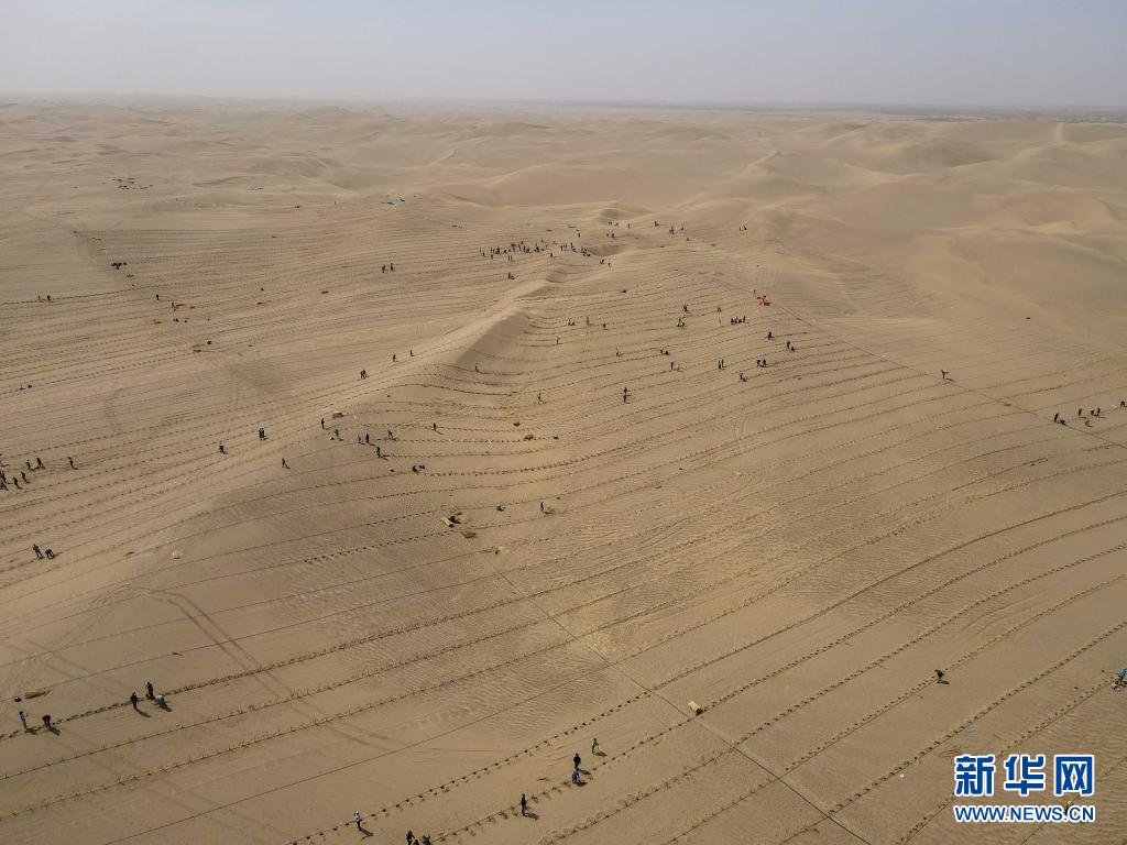 3月28日,人們在且末縣城不遠(yuǎn)處的塔克拉瑪干沙漠內(nèi)植樹(無人機(jī)照片)。