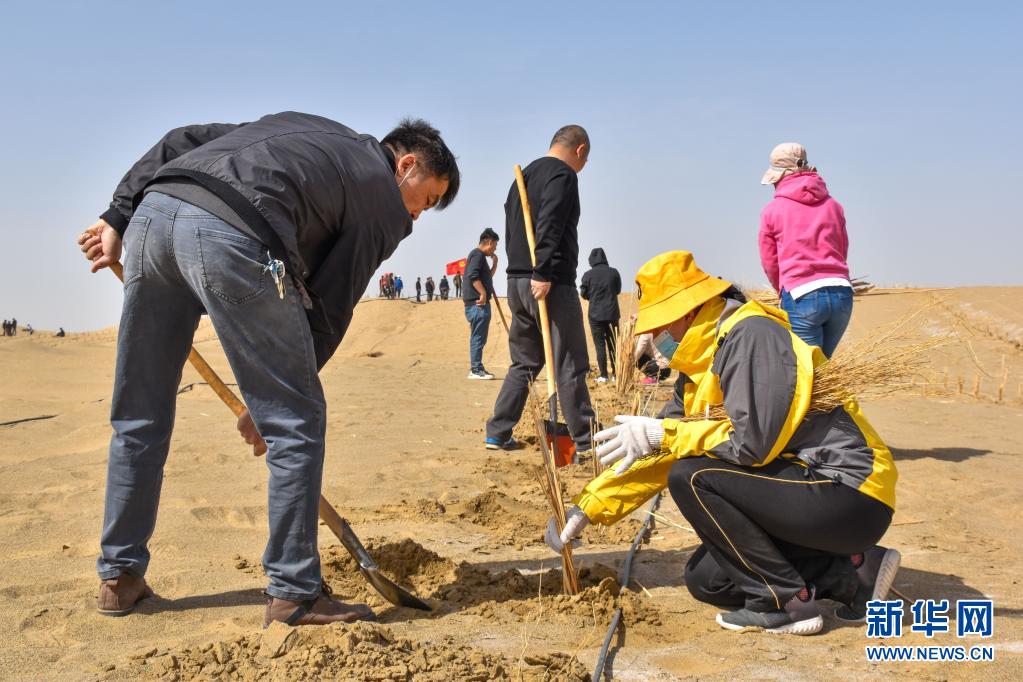 3月28日,當(dāng)?shù)厝罕娫谇夷┛h沙漠中種植梭梭苗。
