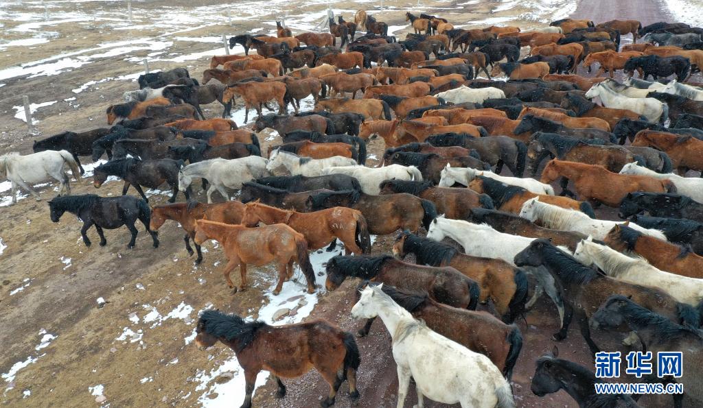 3月31日在山丹馬場拍攝的風(fēng)雪中的馬群(無人機照片)。