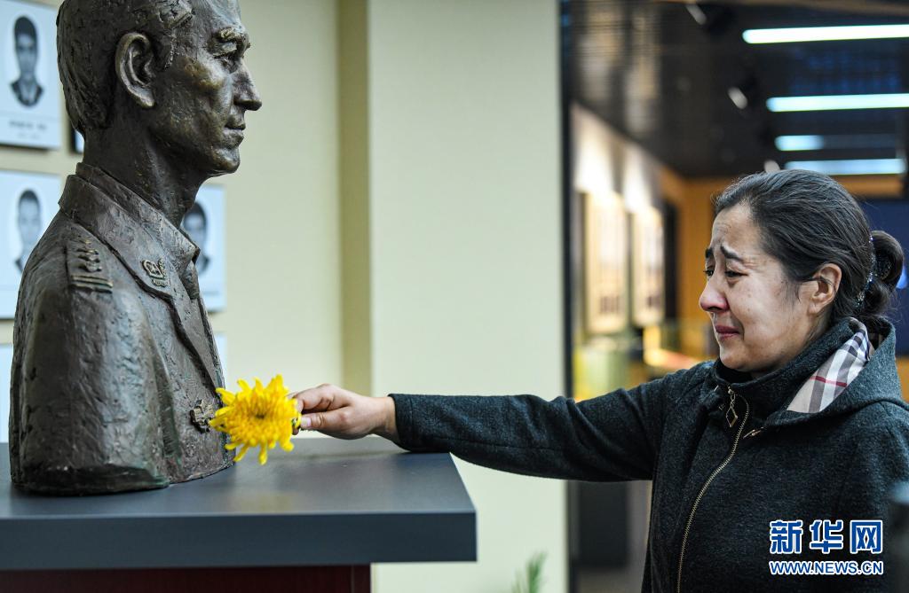 4月3日,在新疆警史館,瑪依努爾在愛(ài)人艾熱提的雕像前擺上菊花。