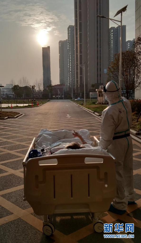 2020年3月5日傍晚,在湖北省武漢大學(xué)人民醫(yī)院東院,復(fù)旦大學(xué)附屬中山醫(yī)院支援湖北醫(yī)療隊(duì)醫(yī)生在護(hù)送患者王欣做CT的途中停下,讓住院近一個月的老人欣賞久違的日落。新華社發(fā)(甘俊超 攝)