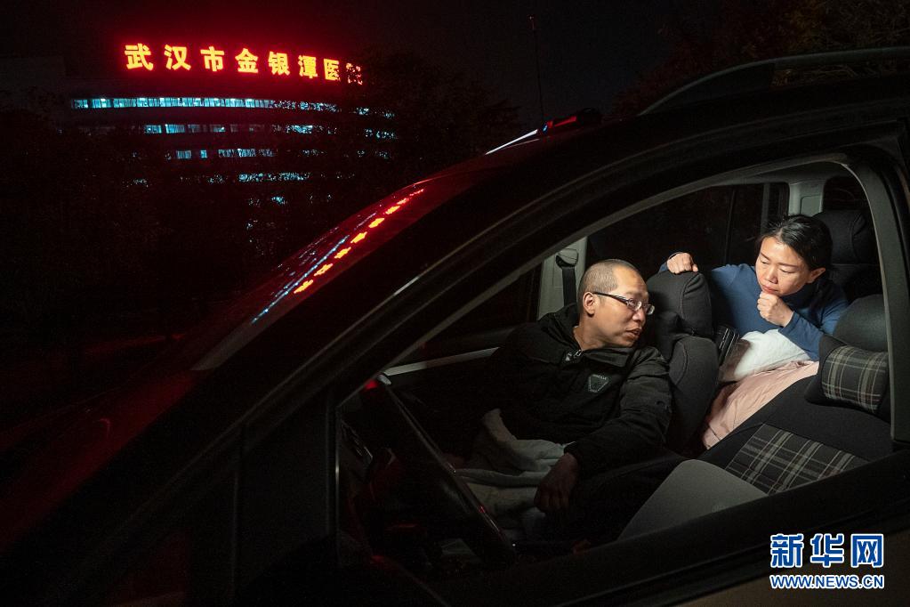 2020年2月22日晚,武漢市金銀潭醫(yī)院的醫(yī)護(hù)夫妻涂盛錦(左)與曹珊在車(chē)內(nèi)聊天。從大年初一開(kāi)始,兩人就住進(jìn)車(chē)?yán)铮瑸樵谝咔橹袚尵炔』?,?zhēng)分奪秒,以車(chē)為家。新華社記者 熊琦 攝