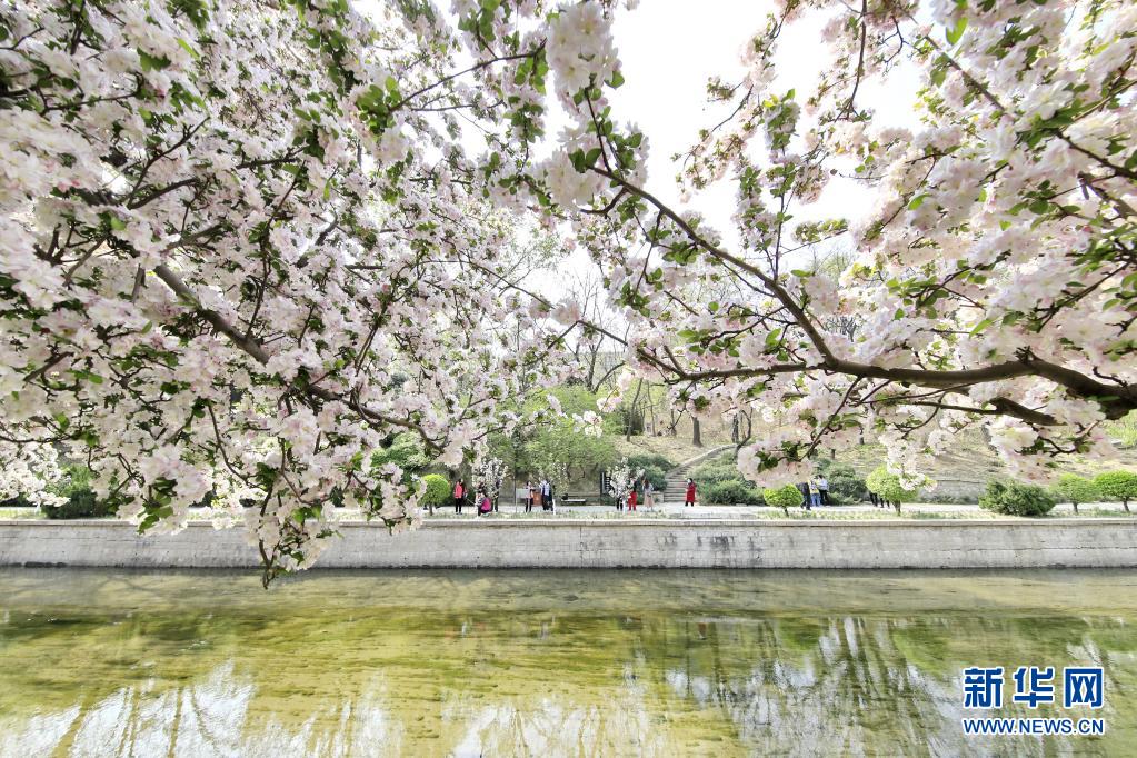 4月8日,游人在北京元大都遺址公園海棠花溪景區(qū)賞花。