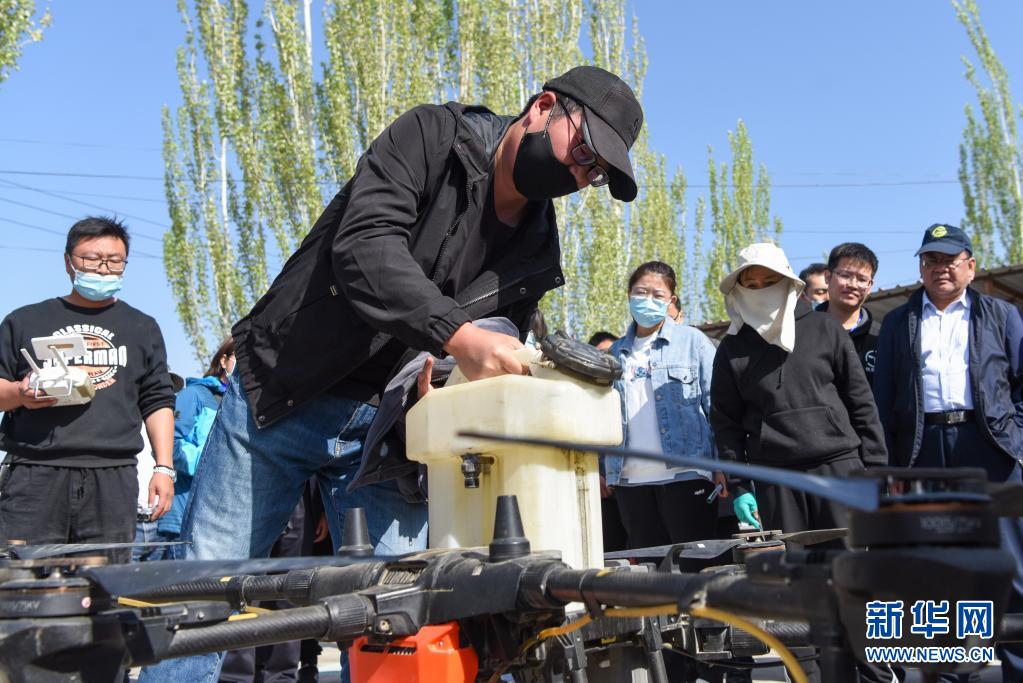 4月11日,在鐵門關(guān)市一處香梨示范園,技術(shù)人員將配制好的花粉稀釋液裝入植保無(wú)人機(jī)。新華社記者 丁磊 攝