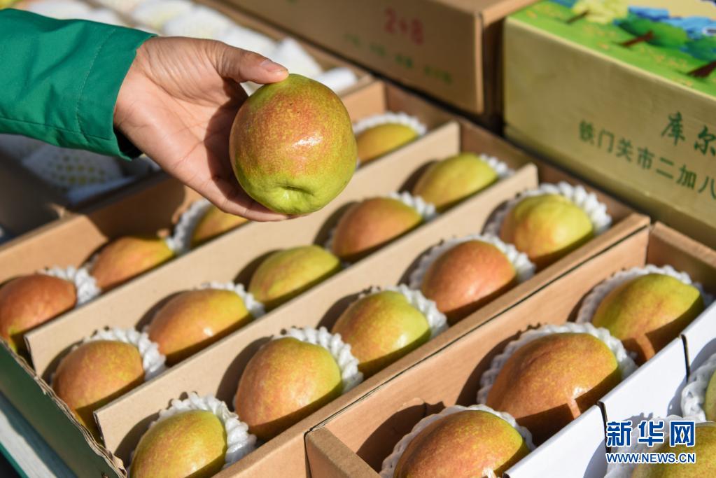 4月11日,在鐵門關(guān)市一處香梨示范園,果農(nóng)展示庫爾勒香梨。新華社記者 丁磊 攝