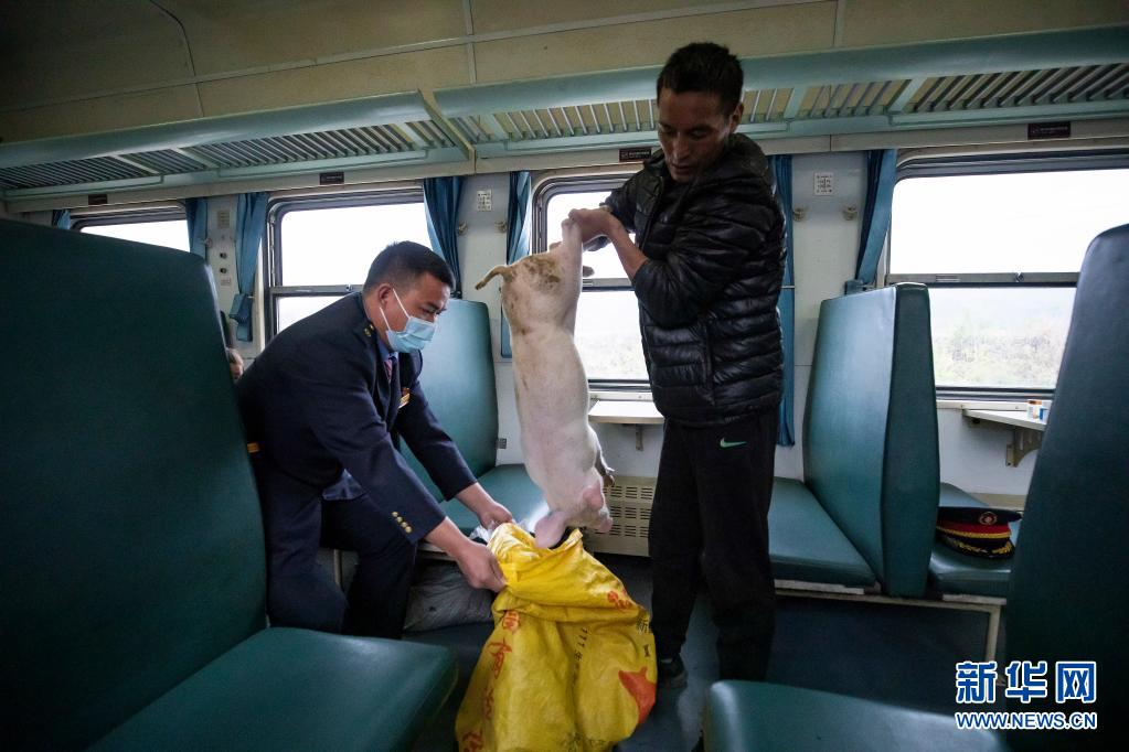 來自越西縣蘇姑鄉(xiāng)的彝族乘客吉木木加(右)帶上火車的小豬從袋子里爬了出來,中國鐵路成都局集團(tuán)公司成都客運(yùn)段5633次彝族列車員俄木日古幫他把小豬重新裝好(4月11日攝)。5633/5634次列車特別配備了6名彝族列車員,以更好地為當(dāng)?shù)匾妥灏傩辗?wù)。新華社記者 沈伯韓 攝