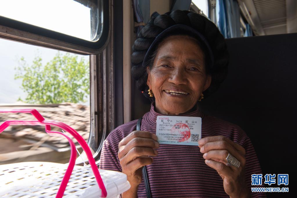 在5634次列車(chē)上,越西縣村民爾古阿吉木展示車(chē)票(4月12日攝)。新華社記者 胥冰潔 攝