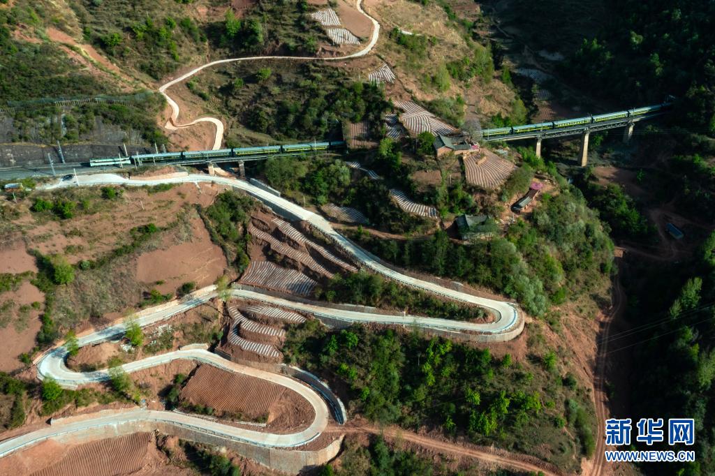 這是即將抵達(dá)成昆鐵路沙馬拉達(dá)站的5634次列車和通站公路(4月11日攝,無(wú)人機(jī)照片)。