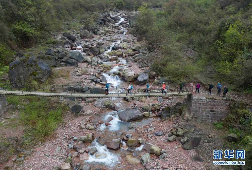 4月18日,徒步愛(ài)好者沿著大相嶺茶馬古道,通過(guò)一座吊橋。新華社記者 江宏景 攝