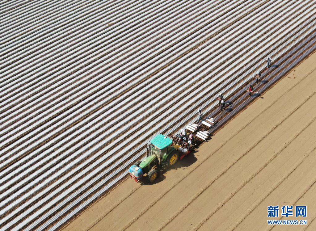 4月20日,工人操作機(jī)械設(shè)備在河北省張家口市塞北管理區(qū)農(nóng)業(yè)基地為剛播種的胡蘿卜覆膜(無(wú)人機(jī)照片)。