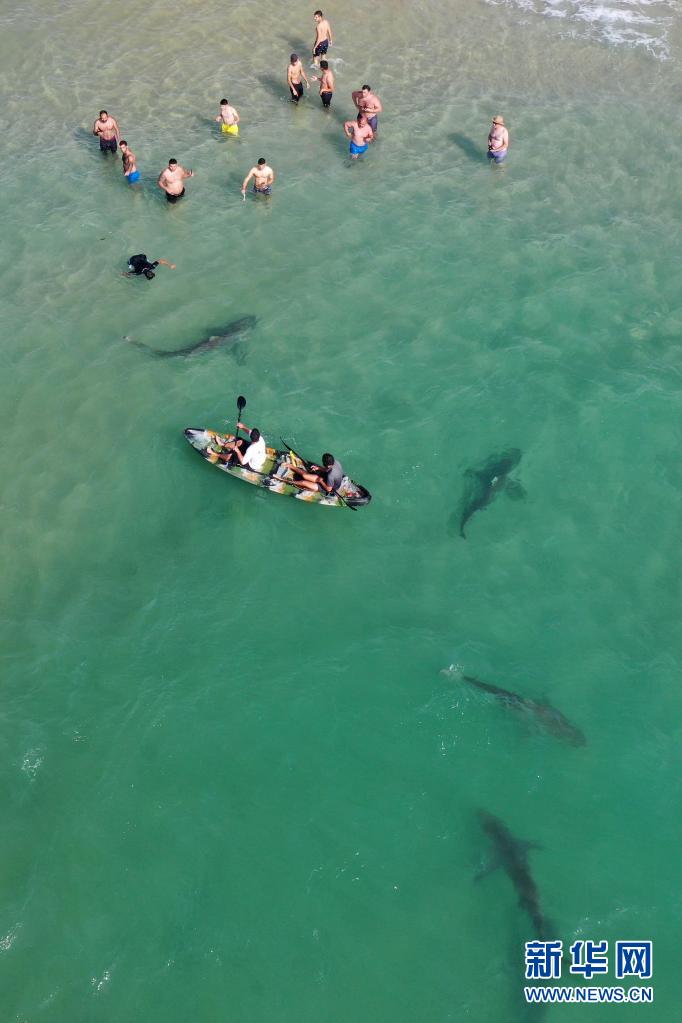 4月20日,在以色列北部城市哈代拉的海邊,鯊魚從人們身邊游過(無人機(jī)照片)。