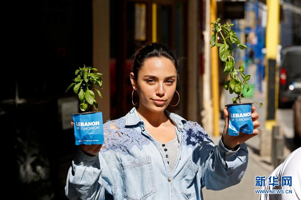 4月22日,一名女子在黎巴嫩首都貝魯特展示獲贈(zèng)的秧苗。