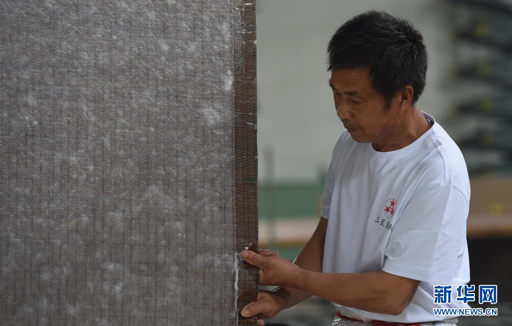 近日,在宣紙產(chǎn)地安徽省宣城市涇縣,“四丈宣紙”的抄制在一家紙業(yè)有限公司啟動。50余名撈紙師傅操作巨型紙簾,齊心協(xié)力,在紙槽旁進行撈紙作業(yè)。來回起落兩次,動作整齊劃一。隨后工人們將紙簾吊起放至一邊揭下,一張巨大的宣紙便撈制成功。經(jīng)過曬、剪等工序后, 制成長13.2米、寬3.6米的巨型宣紙就是“四丈宣紙”。