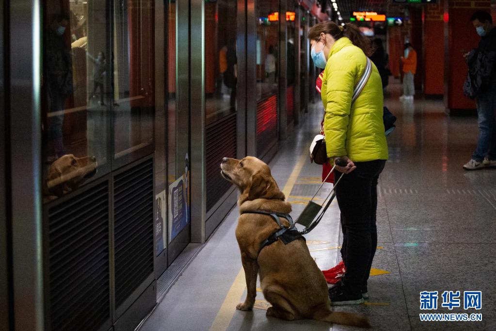 導(dǎo)盲犬“多多”陪伴祝愛葉在地鐵站內(nèi)準(zhǔn)備乘坐地鐵(3月13日攝)?! ⌒氯A社發(fā) (張夢 攝)