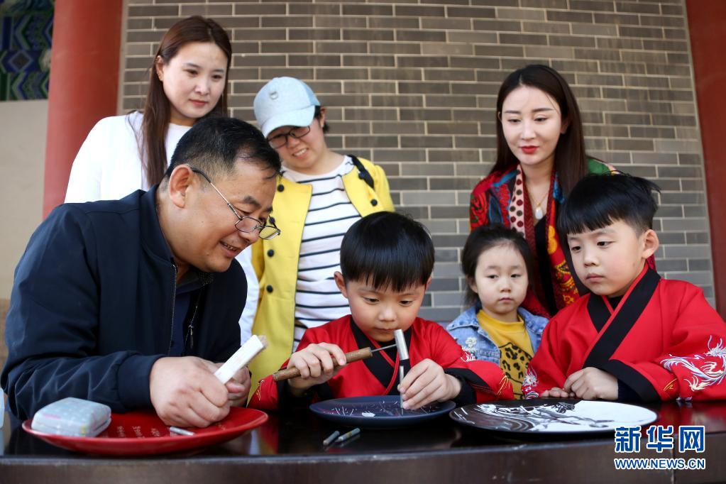 5月1日,在山東省棗莊市孟莊鎮(zhèn)境內(nèi)的龜山風景區(qū),民間藝人胡安同(前左一)向小朋友傳授非遺刻瓷技藝。