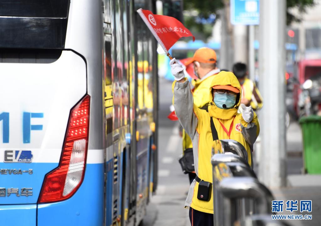 5月6日,在北京市一處公交車站,公共文明引導(dǎo)員在大風(fēng)中引導(dǎo)公交車進(jìn)站。
