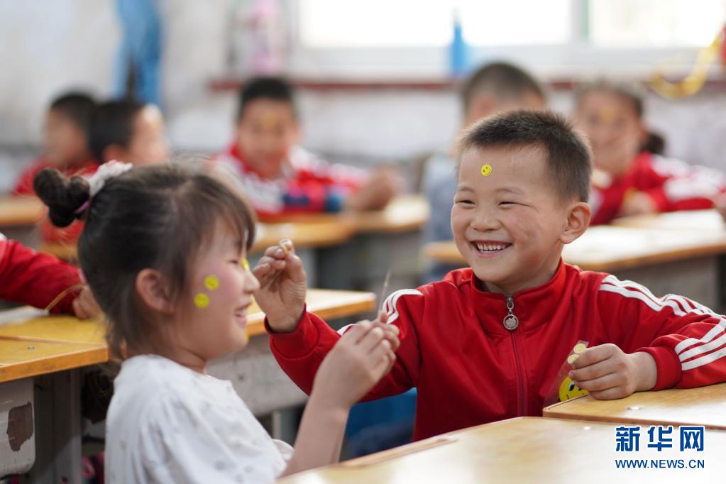 5月7日,河北省邢臺(tái)市內(nèi)丘縣南賽中心小學(xué)的學(xué)生在教室做貼笑臉游戲。世界精神衛(wèi)生組織將每年的5月8日定為“世界微笑日”,希望通過微笑促進(jìn)人類身心健康,增進(jìn)社會(huì)和諧。新華社發(fā)(劉繼東 攝)