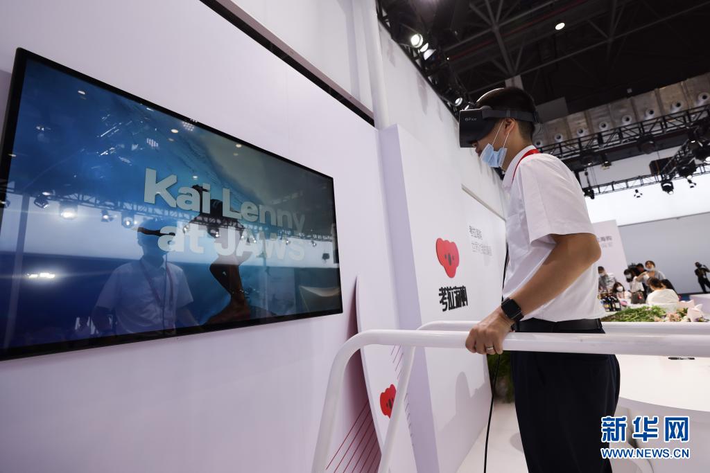 5月7日,觀眾在消博會現(xiàn)場體驗VR沖浪。