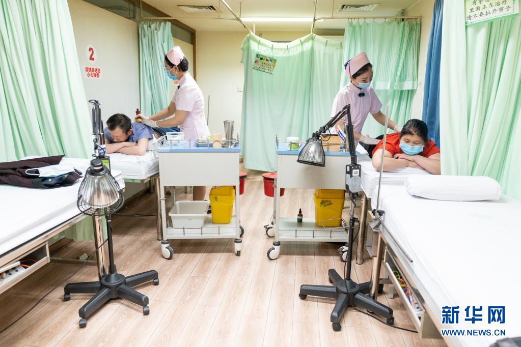 5月10日,在北京按摩醫(yī)院,夜班護(hù)士為患者做中醫(yī)護(hù)理治療。