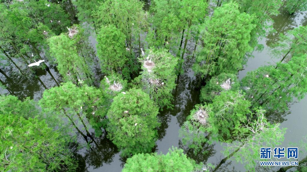 5月12日,在池杉湖國家濕地公園內,鳥兒在池杉林間休息(無人機照片)。