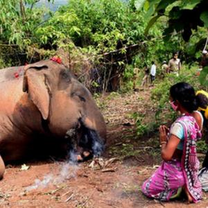 5月14日,一名女子在印度阿薩姆邦納加奧恩地區(qū)一頭死去的象旁禱告。