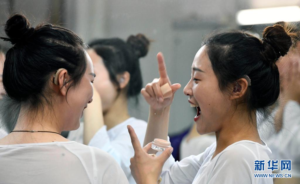 天津理工大學(xué)聾人工學(xué)院的舞蹈隊員們在學(xué)校的劇場里化妝時交流(5月10日攝)。新華社記者 趙子碩 攝