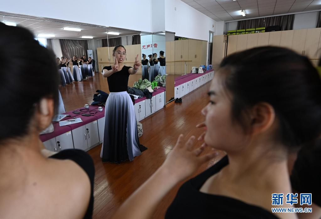 天津理工大學(xué)聾人工學(xué)院的舞蹈隊(duì)員們?cè)趯W(xué)院的排練廳里練習(xí)(5月8日攝)。新華社記者 李然 攝