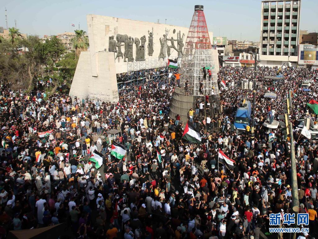 5月15日,人們在伊拉克首都巴格達舉行抗議示威活動,聲援巴勒斯坦民眾。