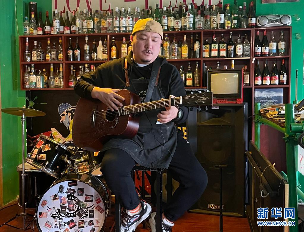 才仁俄賽在餐廳創(chuàng)作音樂(4月12日攝,手機(jī)照片)。新華社記者 劉江 攝